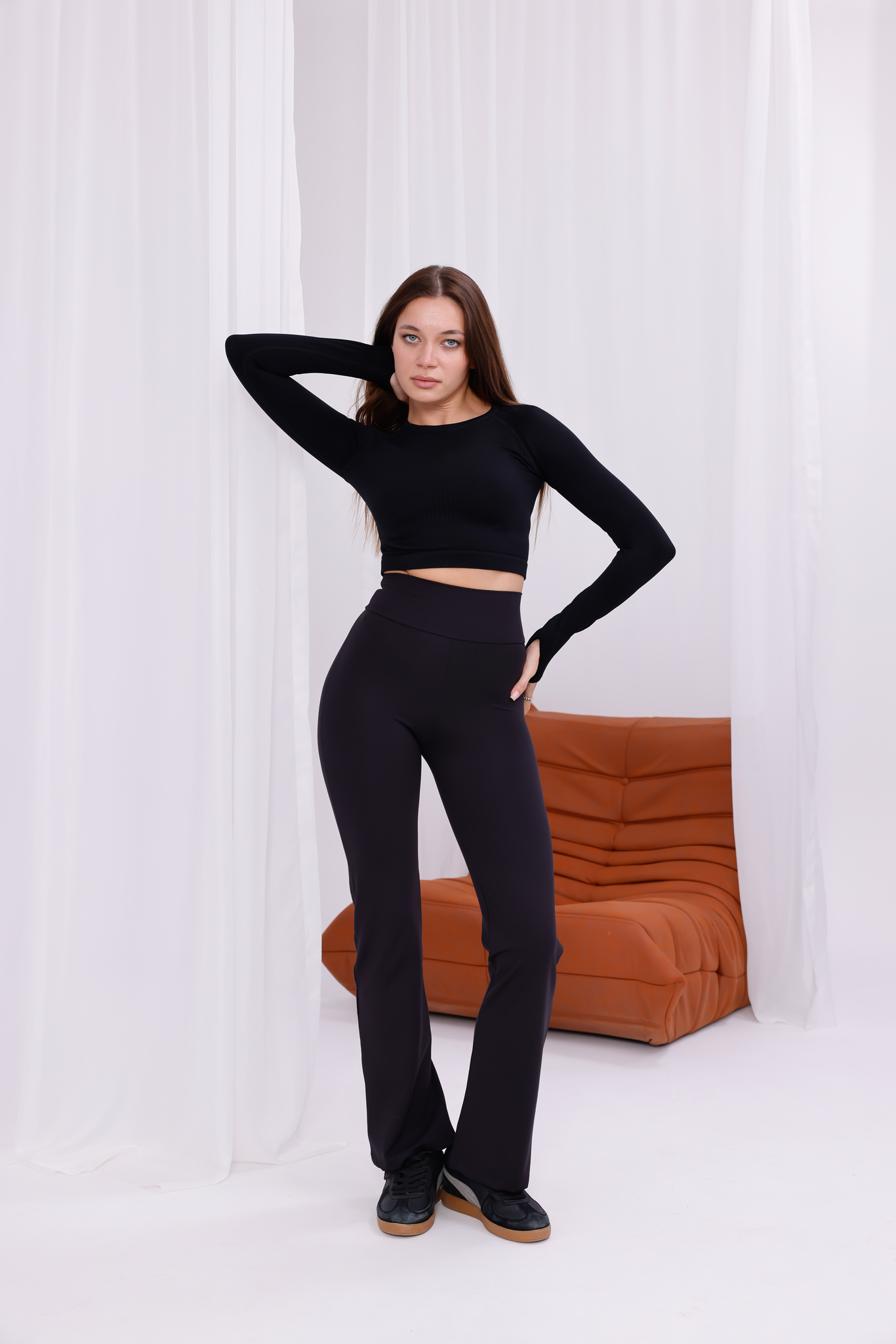 Görseldeki gibi: Aynı renkte, uzun kollu bir crop top/bluz ile modern ve monokrom bir spor şıklık yaratın.
