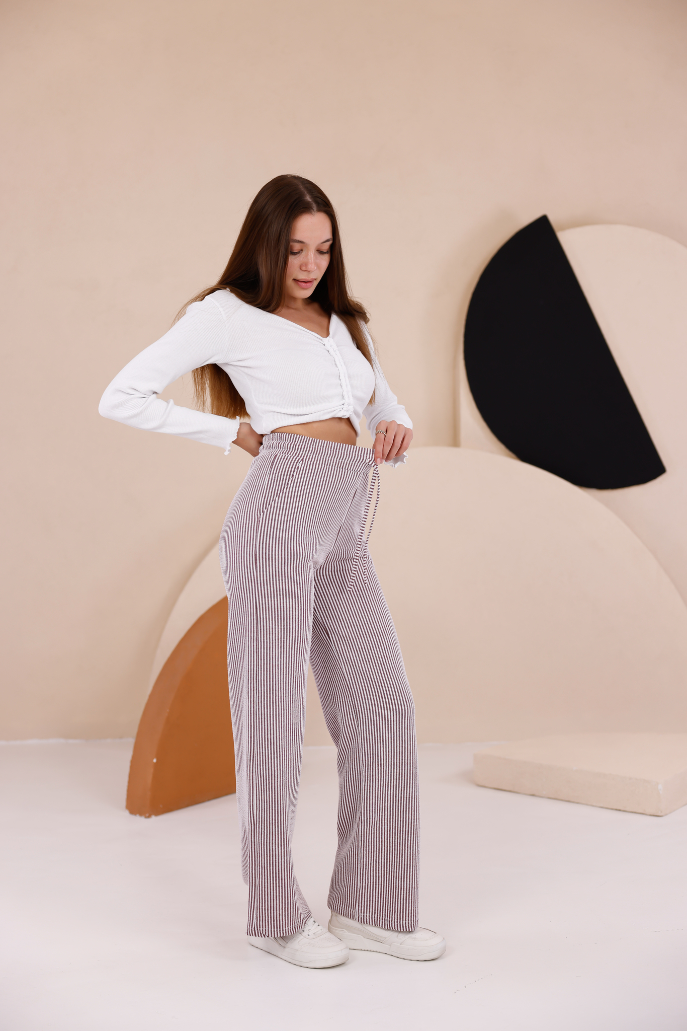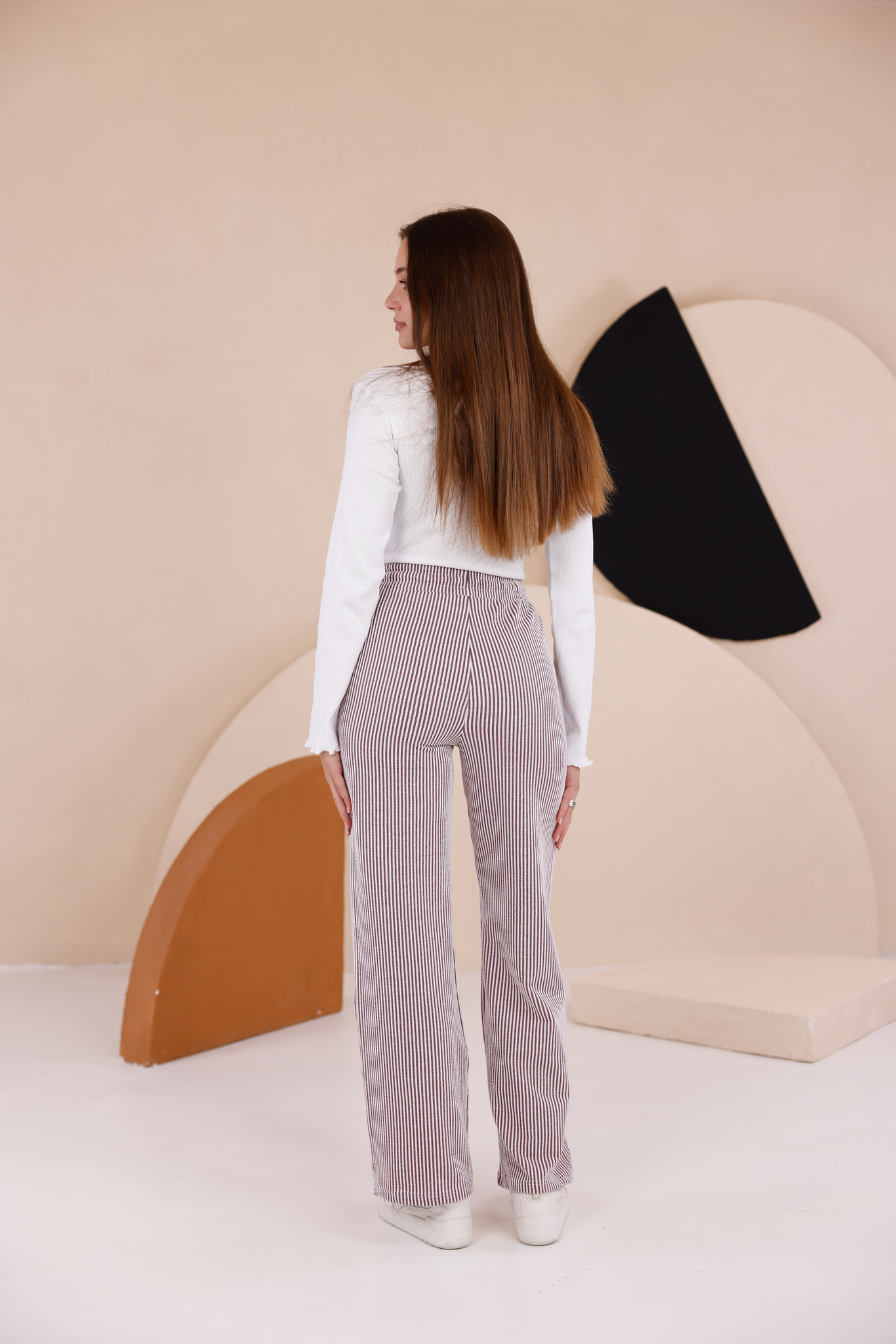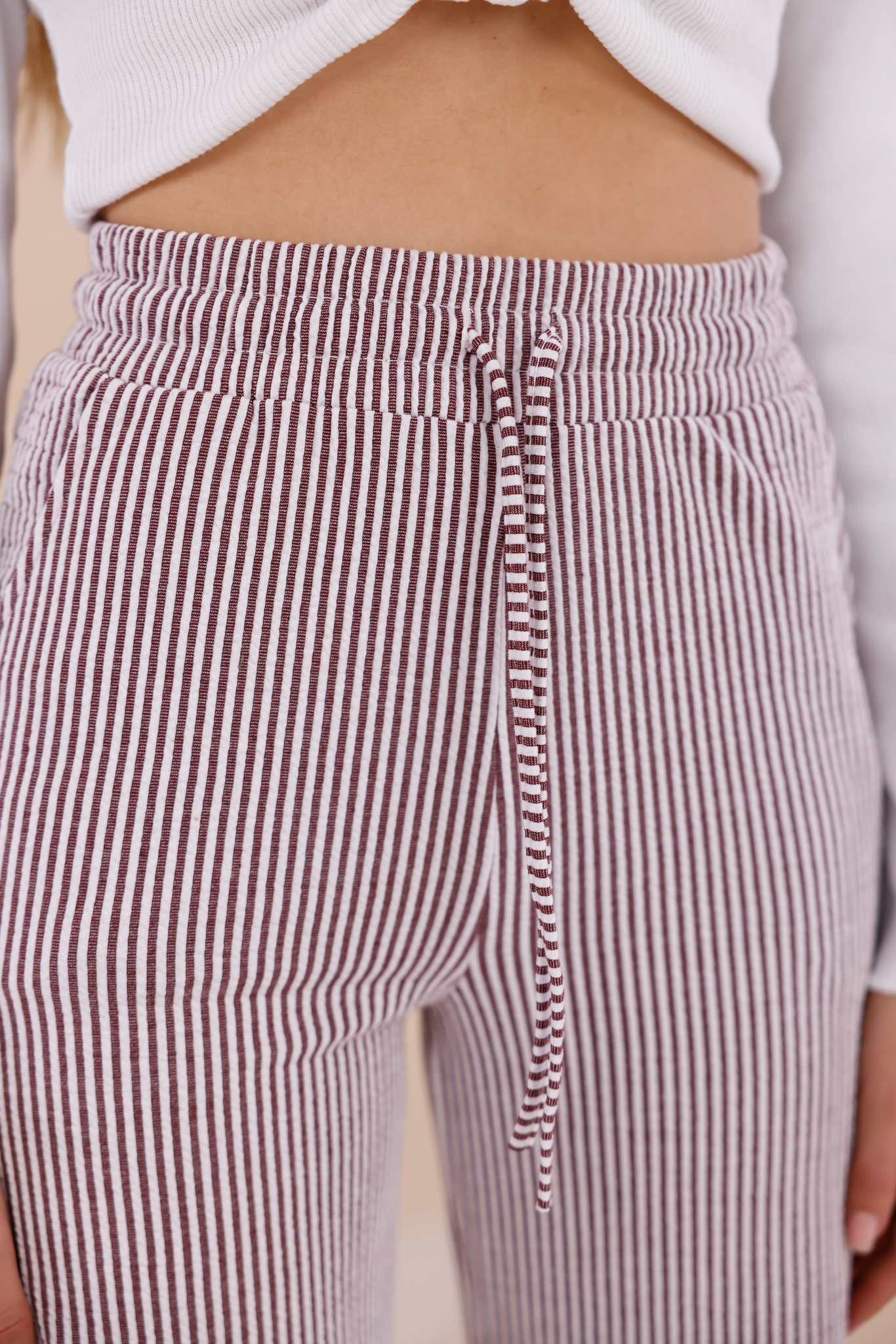 Bordo Çizgili Bol Paça Pantolon ile konforlu ve dinamik stilinizi hemen oluşturun!